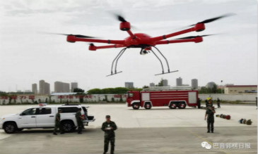 7月1日,在巴州公安消防支隊特勤中隊營區(qū),消防人員正在測試消防無人機(jī)。本報記者汪濤攝 人員被困河中央,河水...
