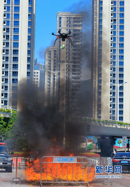 一場(chǎng)消防器材展及滅火演練,6月4日在福建省三明市舉行。當(dāng)?shù)叵谰仍ш?duì)、森林消防支隊(duì)在此間向公眾展示六旋翼消防無(wú)...