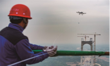 兩岸主塔均已封頂先導(dǎo)索是直徑2mm的杜邦絲就緒無(wú)人機(jī)放飛過(guò)江全神貫注無(wú)人機(jī)帶著先導(dǎo)索接近北岸主塔塔頂&em...   ...