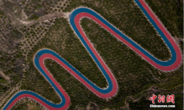 5月7日,山西省太原市,無(wú)人機(jī)航拍西山旅游公路一段彩色路面。這段公路鋪設(shè)了紅藍(lán)兩色瀝青,為當(dāng)?shù)嘏e辦國(guó)際公路自行車(chē)...